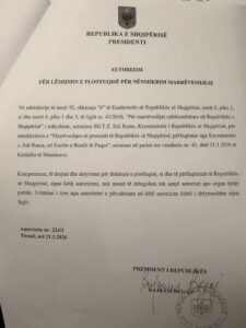 Presidenti i Republikës, Bajram Begaj, ka autorizuar sot Kryeministrin Edi Rama për të nënshkruar marrëveshjen e aderimit të Shqipërisë në Kartën e Bordit të Paqes, një iniciativë ndërkombëtare për promovimin e stabilitetit dhe paqes në zonat e konfliktit.