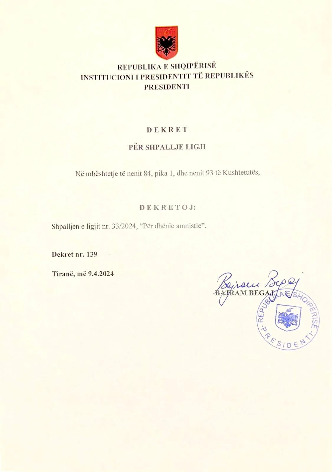 Presidenti i Republikës, Bajram Begaj, firmosi sot dekretin për amnistinë penale, që u miratua pak ditë më parë në Kuvend.