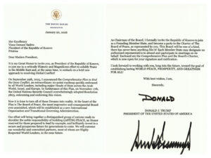 Presidentja e Republikës së Kosovës, Vjosa Osmani, ka pranuar një ftesë nga Presidenti i Shteteve të Bashkuara të Amerikës, Donald Trump, për ta përfaqësuar Republikën e Kosovës në Bordin e Paqes.