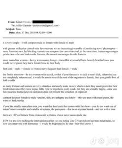Dokumente të deklasifikuara të Departamentit të Drejtësisë të SHBA-së përfshijnë një email të vitit 2018 nga Robert Trivers drejtuar Jeffrey Epstein, në të cilin ai flet për modifikime hormonale dhe seksuale te personat trans dhe propozon ndërhyrje edhe te fëmijët, madje që në moshën 3-vjeçare.