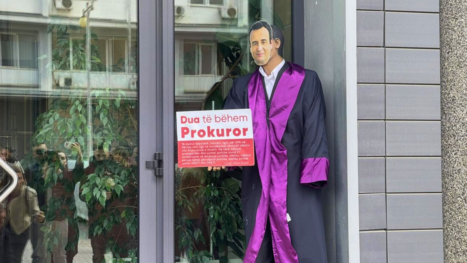 Në hyrje të Kuvendit të Kosovës, PSD-ja ka vendosur një kukull me fotografinë e kryeministrit Kurti i veshur me togë të prokurorit, e në të cilën shkruan “Dua të bëhem prokuror”.