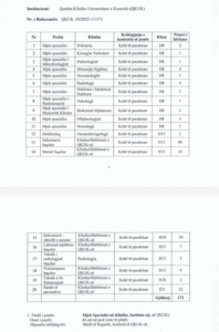 Në njoftimin zyrtar të QKUK-së thuhet se kërkohen mjekë specialistë, infermierë, laborantë mjekësorë, teknikë të radiologjisë, fizioterapeutë, teknikë të fizioterapisë si dhe bartës të pacientëve.