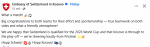 Jemi të lumtur që Zvicra siguroi kualifikimin për Botërorin 2026 dhe që Kosova do të garojë në ‘play-off’ — po i përkrahim me entuziazëm të dyja nga Prishtina!