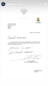 Klubi madrilen i ka dërguar një letër zyrtare Asllanit, duke i uruar shërim të shpejtë dhe duke shprehur mbështetje të plotë institucionale nga e gjithë struktura e klubit, përfshirë edhe presidentin Florentino Pérez.