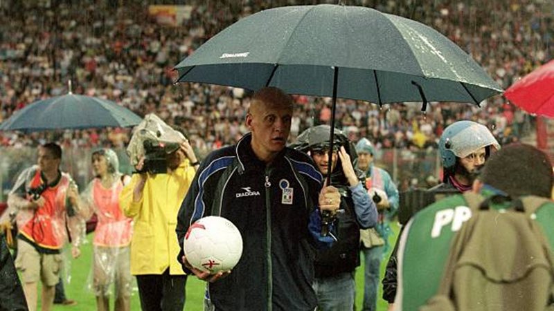 Shiu ra me forcë aq të madhe sa arbitri Pierluigi Collina u detyrua të ndalonte ndeshjen për më shumë se një orë. Pamja e tij në fushë, me ombrellë në dorë dhe topin në këmbë, për të parë nëse topi kërceu në ndonjë copë bari, u bë ikonike — një moment që mbeti në historinë e futbollit.