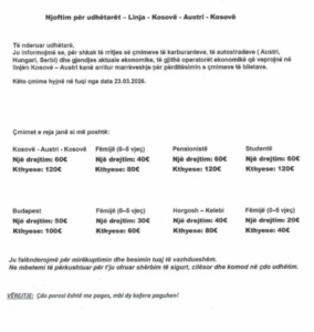 Udhëtarët që frekuentojnë linjën Kosovë – Austri do të përballen me çmime të reja të biletave, si pasojë e rritjes së kostove të operimit.