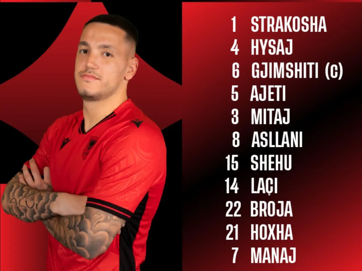 SHQIPËRIA: Strakosha, Gjimshiti, Ajeti, Hysaj, Mitaj, Shehu, Laçi, Asllani, Hoxha, Broja, Manaj.