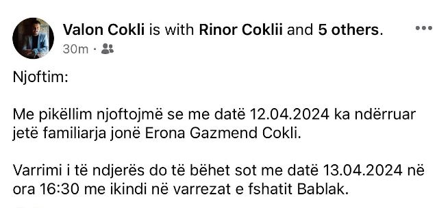 LAJME Sot varroset 21-vjeçarja që u vra dje në Ferizaj By G.O. 13 April, 2024 - 12:23 Share FacebookTwitterPinterestWhatsApp Sot varroset 21-vjeçarja, Erona Cokli që u vra ditën e premte në Qendrën për Punë Sociale në Ferizaj. E ndjera do të varroset në varrezat e fshatit Bablak, në orën 16:30. Kështu bën të ditur familjarët e 21-vjeçares. Ndërkaq, i dyshuar për vrasjen e Erona Coklit është ish-bashkëshorti i së ndjerës. Klikoni KËTU për t’u bërë pjesë e kanalit zyrtar të ATVLIVE.TV në Viber. Bëni Subscribe në kanalin zyrtar të ATV-së në YouTube – Kliko KËTU Share FacebookTwitterPinterestWhatsApp LAJME TË TJERA Situata me buxhetin, Përparim Rama sot mban konferencë për media 23 November, 2025 - 11:22 Reagon ushtari që braktisi uniformën e FSK-së dhe u ndal në SHBA: Um myti lemza 23 November, 2025 - 11:16 Theren me thikë dy të mitur në Prishtinë, policia jep detaje 23 November, 2025 - 11:13 Protesta në Izrael, kërkohet dorëheqja e Netanyahut 23 November, 2025 - 11:08 Your browser does not support the video tag. PUBLIKUAR SË FUNDI Situata me buxhetin, Përparim Rama sot mban konferencë për media K.B. - 23 November, 2025 - 11:22 Reagon ushtari që braktisi uniformën e FSK-së dhe u ndal në SHBA: Um myti lemza K.B. - 23 November, 2025 - 11:16 Theren me thikë dy të mitur në Prishtinë, policia jep detaje K.B. - 23 November, 2025 - 11:13 Protesta në Izrael, kërkohet dorëheqja e Netanyahut K.B. - 23 November, 2025 - 11:08 S’respektuan rregullat në trafik, policia për një ditë shqiptoi mbi 1500 gjoba K.B. - 23 November, 2025 - 11:03 Vdes në spitalin e Prizrenit punëtori që u lëndua në korrik në vendin e punës K.B. - 23 November, 2025 - 11:02 KEDS tregon se ku do të ketë ndërprerje të rrymës sot K.B. - 23 November, 2025 - 11:00 LAJME TË TJERA Situata me buxhetin, Përparim Rama sot mban konferencë për media 23 November, 2025 - 11:22 Reagon ushtari që braktisi uniformën e FSK-së dhe u ndal në SHBA: Um myti lemza 23 November, 2025 - 11:16 Theren me thikë dy të mitur në Prishtinë, policia jep detaje 23 November, 2025 - 11:13 Protesta në Izrael, kërkohet dorëheqja e Netanyahut 23 November, 2025 - 11:08
