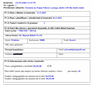 Tenderi i është besuar operatorit ekonomik “Pricom” Sh.P.K, i cili ka ofruar furnizimin për një vlerë prej 84,252 euro.