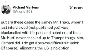 Në njoftimin e tij, Martens përmend edhe kryeministrin në detyrë, Albin Kurti, presidenten Vjosa Osmani, si dhe presidentin amerikan Donald Trump, por pa dhënë më shumë detaje.