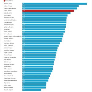 Shqipëria renditet si kryeqyteti i katërt më i shtrenjtë në Europë, pas Moskës në Rusi, që kryeson me 22 vite, Lisbonës në Portugali me 19.2 vite dhe Pragës në Republikën Çeke me 18.6 vite. Në Romë, kryeqytetin Italian, duhen mesatarisht 14.5 vite punë, po kaq dhe në Vjenë, në Paris 15.4 vite. Tirana ia ka kaluar dhe Beogradit, që deri tani mbante fronin si kryeqyteti më i shtrenjtë në rajon, sipas fuqisë blerëse, i cili ka zbritur pas kryeqytetit shqiptar, me 16.4 vite.