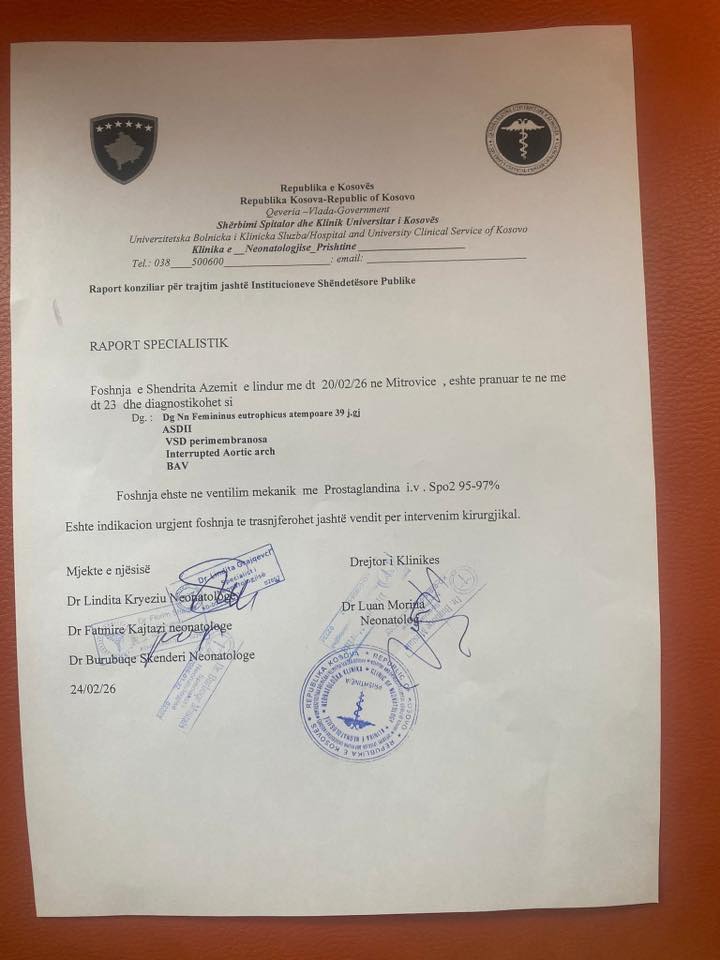 Sipas rrëfimit të tij, vogëlushja erdhi në jetë të premten, më 20.02.2026. Por gëzimi i prindërve u shndërrua shpejt në ankth, pasi mjekët konstatuan një problem serioz në zemër – një çrregullim në arterien kryesore që furnizon trupin me gjak.