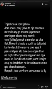 Tutje tha: “Thjesht situata e sotit ka dal jashtë kontrollit, edhe marrë prej asaj x personit për ato fjalë që sot janë thënë në Big Brother janë menaxhuar mirë nga nëna ime”.