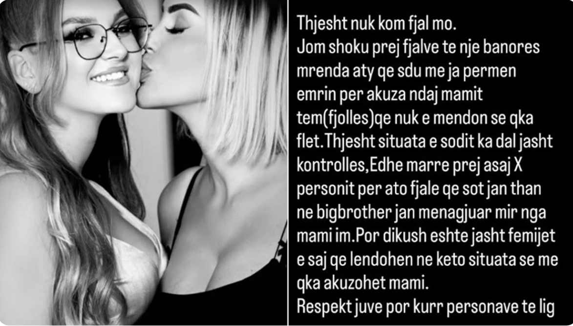 Tutje tha: “Thjesht situata e sotit ka dal jashtë kontrollit, edhe marrë prej asaj x personit për ato fjalë që sot janë thënë në Big Brother janë menaxhuar mirë nga nëna ime”.