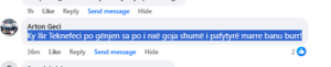 “Ky Ilir Teknefeci po gënjen sa po i nxë goja, shumë i pafytyrë, marre banu burr!”, ka shkruar Artoni, vëllai i deputetit të Guxo, Fatos Geci.